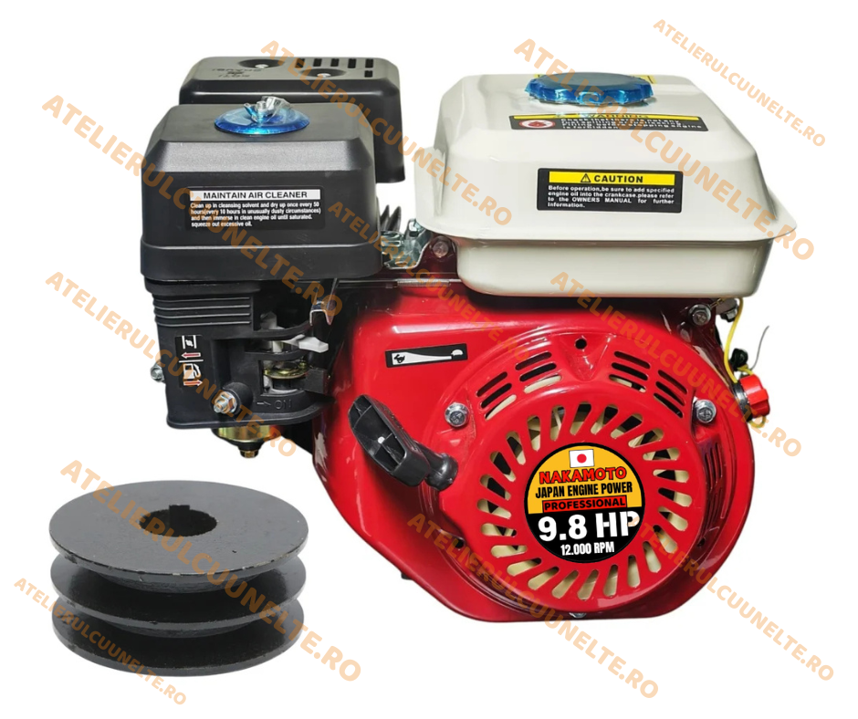 Construit pentru a face fata solicitarilor intense din domeniul agricol si industrial, motorul Nakamoto este dotat cu un arbore orizontal pe pana de 3/4 toli (20mm), racire pe aer si aprindere electrica tranzistorizata, ceea ce asigura o functionare stabila si de lunga durata. Cu o viteza maxima de 12.000 rpm, acest motor poate fi integrat cu usurinta pe echipamente precum motopompe, generatoare, motocultoare sau motocositori.