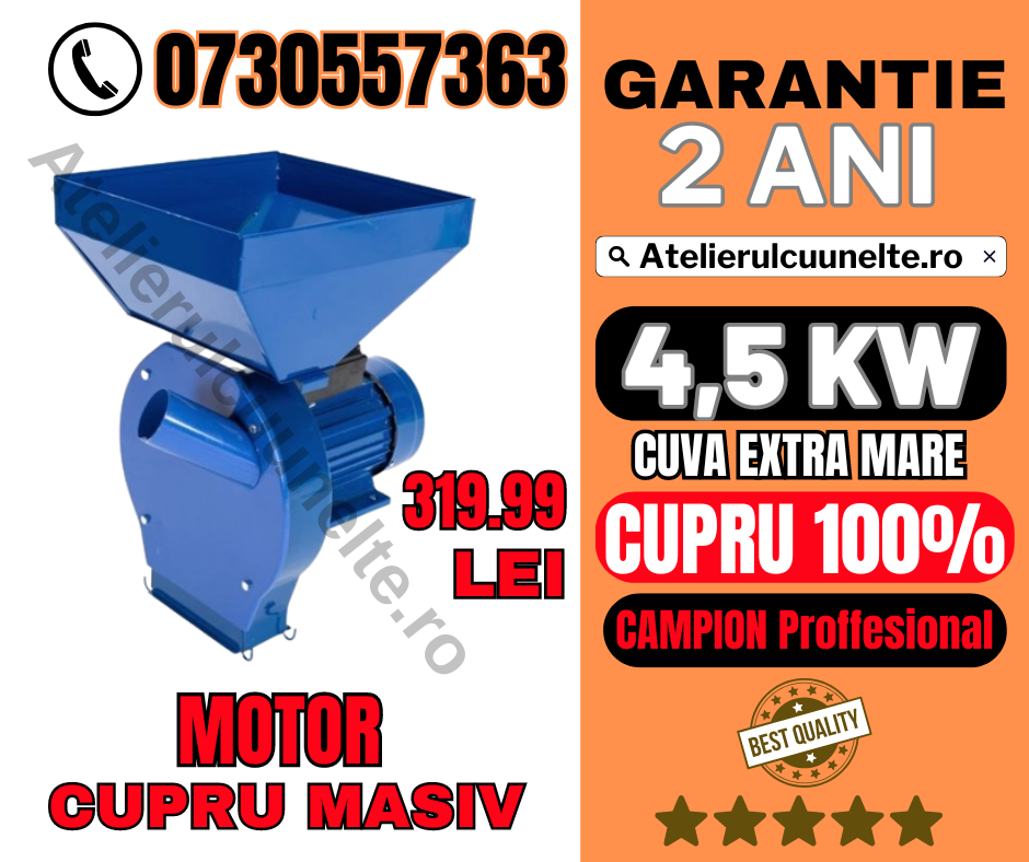 O moara uruiala, moara cereale, este foarte utila pentru orice gospodar care creste diverse pasari sau animale domestice. Acest model de moara electrica va ajuta foarte mult sa va faceti singuri uruiala sau sa tocati stiuletii in regim casnic, fara a mai fi nevoie sa mergeti la moara sau la alti vecini care au deja un astfel de produs. Cu un design robust si motor foarte rezistent, cu aceasta moara de cereale veti putea macina cereale in conditii casnice, avand posibilitatea de a produce uruiala sau chiar faina din diverse tipuri de cereale.